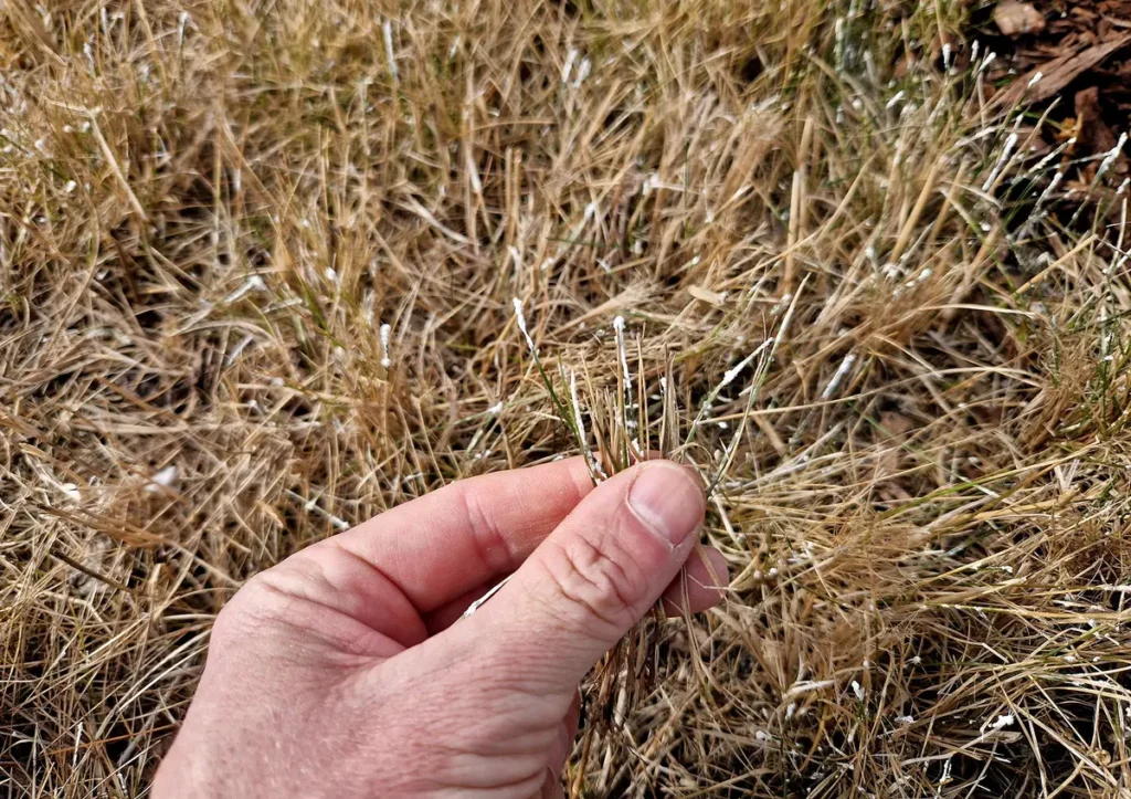 Snow insulates grass by keeping the soil warmer and protecting its roots and crowns from freezing winds. It also helps prevent early seed germination on those unexpectedly warm days in winter. Plus, snow is a source of slow-drip irrigation and atmospheric nitrogen. On the downside, snow can play host to snow mold. However, the higher temperatures of early-to-mid-spring will cause the fungi to die off. Snow mold appears as circular, matted areas of discolored grass.